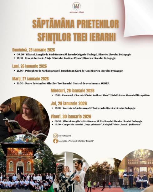 Asociația „Prietenii Sfinților Trei Ierarhi”, în parteneriat cu Parohia „Sfântul Ierarh Ioan Gură de Aur” – Copou și Colegiul Național Pedagogic „Vasile Lupu” Iași, organizează Hramul Asociației „Prietenii Sfinților Trei Ierarhi”, al Bisericii și al Colegiului Național Pedagogic „Vasile Lupu” Iași, în zilele de joi, 29 ianuarie 2026, și vineri, 30 ianuarie 2026. Manifestările vor avea loc la Biserica „Sfinții Trei Ierarhi” din cadrul Colegiului Pedagogic.